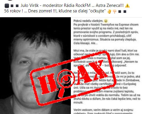 Predmetný užívateľ podľa polície status okomentoval: „Julo Viršk – moderátor Rádia RockFM … Astra Zeneca!!! 56 rokov ! … Dnes zomrel !!!, kľudne sa ďalej „očkujte“. Polícia však pripomína, že podľa doterajších informácií skonal moderátor na chate v Malých Levároch na Záhorí na zástavu srdca.