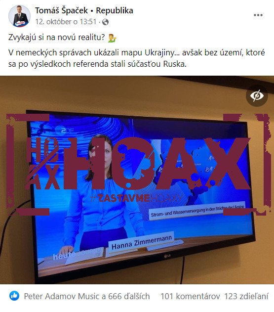 „Dezinformačné vody slovenského facebooku sa snažia legitimizovať ukradnutie ukrajinských území Ruskom. Aktuálne prebrali falošnú správu prokremeľských médií a proruských aktivistov o tom, že nemecká štátna televízia ZDF uznala anektované územia Ukrajiny ako súčasť Ruska,“ napísala Polícia SR.