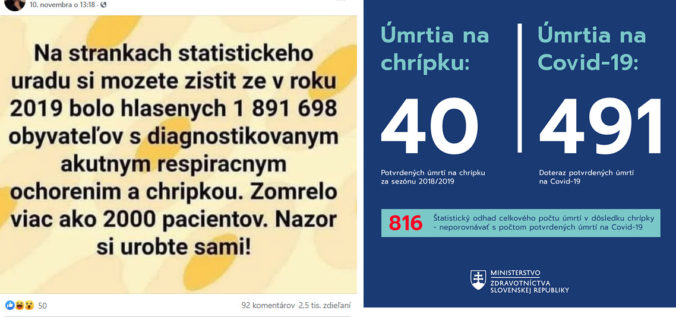 24.11.2020 (Webnoviny.sk) – Polícia upozorňuje na hoax porovnávajúci počty úmrtí, ktoré môžu súvisieť s chrípkou a ďalšími respiračnými ochoreniami s oficiálne potvrdenými úmrtiami na ochorenie COVID-19.