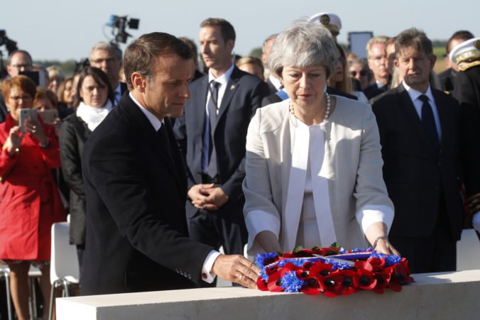 Veteráni v uniformách vo veku 90 a viac rokov sa prizerali, ako Mayová s Macronom vystúpili s prejavmi vo francúzskom Ver-Sur-Mer počas ceremónie pokladania základného kameňa nového pamätníka, ktorý pripomenie mená tisícov vojakov pod britským velením, ktorí padli v Deň D a nasledujúcej bitke v Normandii.